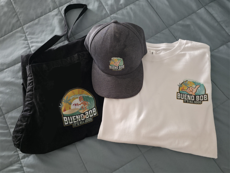 Bueno Bob™ is developing our store for custom-branded high-end merchandise like T-shirts, hats, aprons, dinnerware, and more. Our store will be ready before the end of the year. Please check back.
